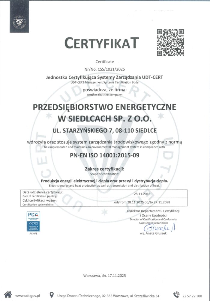 Dumą Przedsiębiorstwa Energetycznego w Siedlcach Sp. z o.o. są osiągnięcia w zakresie ochrony środowiska, m.in. znaczna redukcja emisji zanieczyszczeń osiągnięta poprzez likwidację lokalnych kotłowni, w tym osiedlowej kotłowni La Montea, modernizację kotłów i urządzeń odpylania, uruchomienie stałego pomiaru i rejestrację emisji zanieczyszczeń w źródłach, a także wprowadzenie kogeneracji i energii odnawialnej z zastosowaniem technologii solarnej.