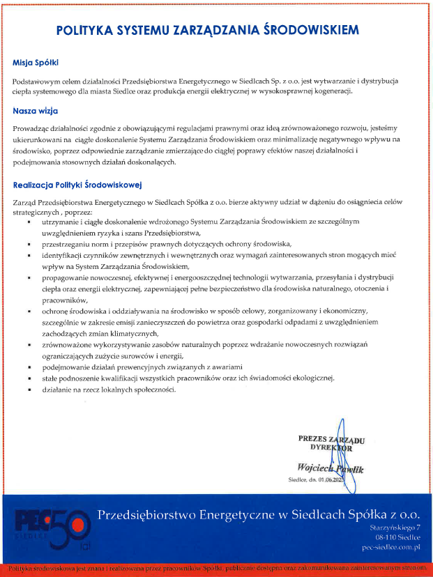 Przyjęta przez Zarząd oraz załogę Polityka Środowiskowa ma na celu minimalizację negatywnego wpływu działalności PEC na środowisko.
